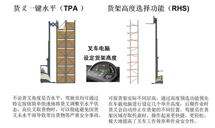 本款叉車(chē)獨(dú)創(chuàng)性技術(shù)一鍵升高到位取貨,