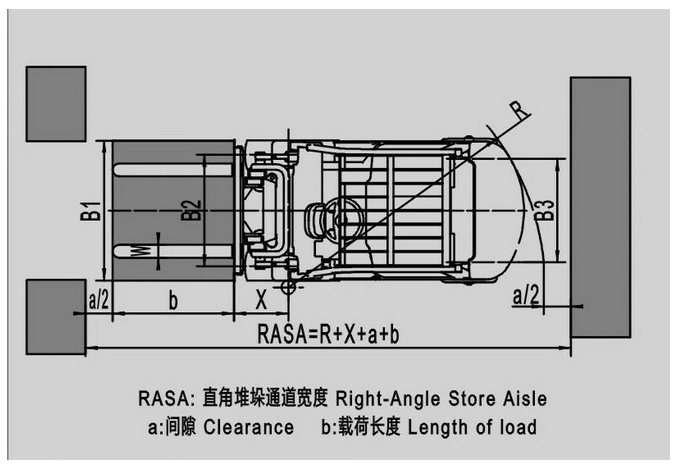 計算工式:直角堆垛通道寬度 = 轉彎半徑R + 前懸距X + 貨叉/托盤的長度b + 安全間隙a
