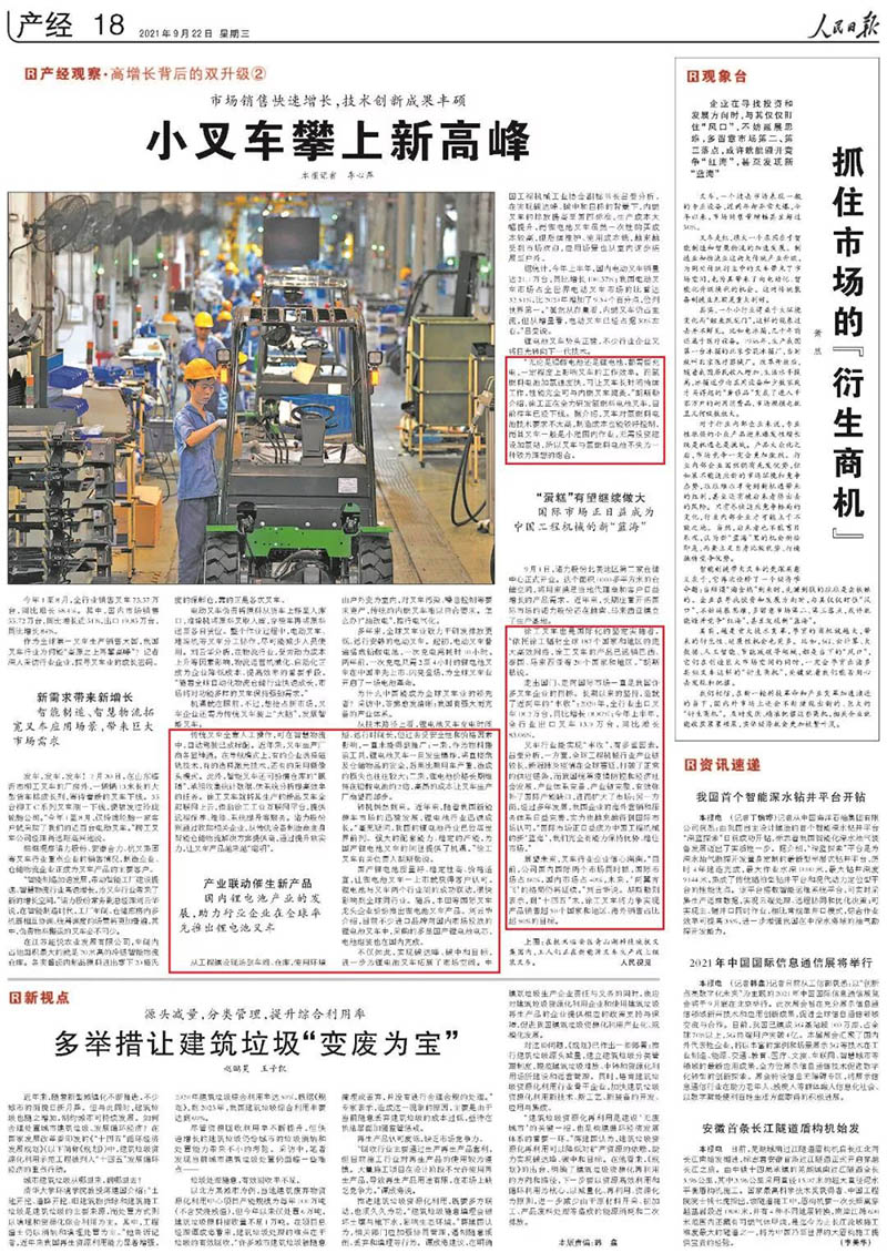 近日,《人民日報(bào)》再次聚焦徐工,推出產(chǎn)經(jīng)觀察專欄文章《小叉車攀上新高峰》,文章指出,作為全球第一叉車生產(chǎn)銷售大國,我國叉車行業(yè)的銷售數(shù)據(jù)再攀高峰。今年1至8月,全行業(yè)銷售叉車75.57萬臺,同比增長58.4%。其中,國內(nèi)市場銷售55.72萬臺,同比增長近51%,出口19.85萬臺,同比增長84%。