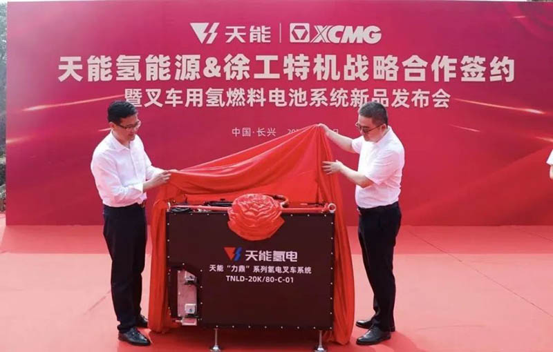 2021年9月28日,天能氫能源與徐工集團(tuán)旗下公司徐州徐工特種工程機(jī)械有限公司(下稱(chēng)“徐工特機(jī)”)簽訂戰(zhàn)略合作協(xié)議。簽約儀式現(xiàn)場(chǎng),天能氫能源正式發(fā)布了徐工叉車(chē)用氫燃料電池系統(tǒng)新品。