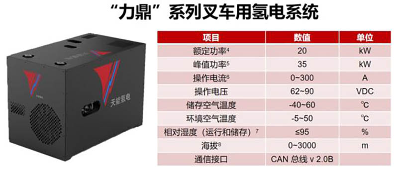 此次天能氫能源與徐工特機(jī)合作打造的適用于叉車(chē)專(zhuān)用的“力鼎”燃料電池系統(tǒng),額定輸出20kW,峰值輸出可達(dá)35kW,燃料電池電堆設(shè)計(jì)壽命可達(dá)10000h,兼容市面上大部分鉛酸或鋰電電動(dòng)叉車(chē)。產(chǎn)品在徐工叉車(chē)上進(jìn)行配置應(yīng)用后呈現(xiàn)“體積小,零碳排,加氫3分鐘、工作5小時(shí)”的特點(diǎn),有效解決了新能源叉車(chē)產(chǎn)品的續(xù)航問(wèn)題。